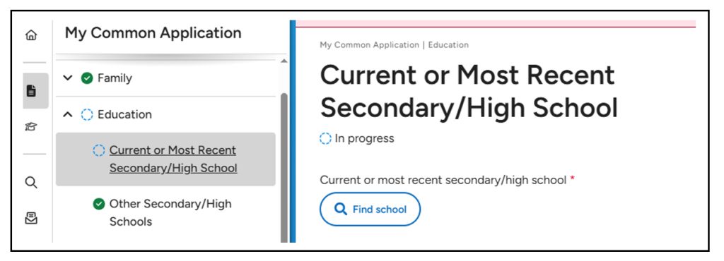 Before you begin entering your coursework, you will need to add your high school information to the Common App Education section by selecting Find School.