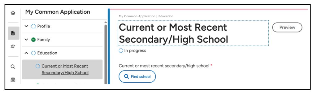 If you are currently enrolled in grade 12, report your senior year coursework in the Current or Most recent Secondary/High School section of the Common App Profile under the Education tab.