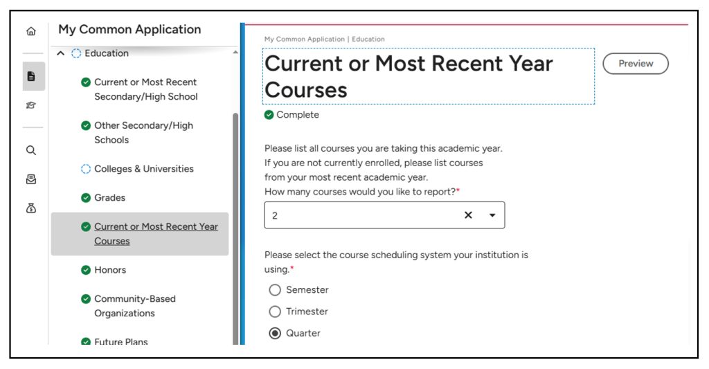 If you have not yet graduated high school, you will need to report your courses for the current academic year typically this is your senior or grade 12 academic year. Complete the Current or Most Recent Courses section of the Common App Profile.