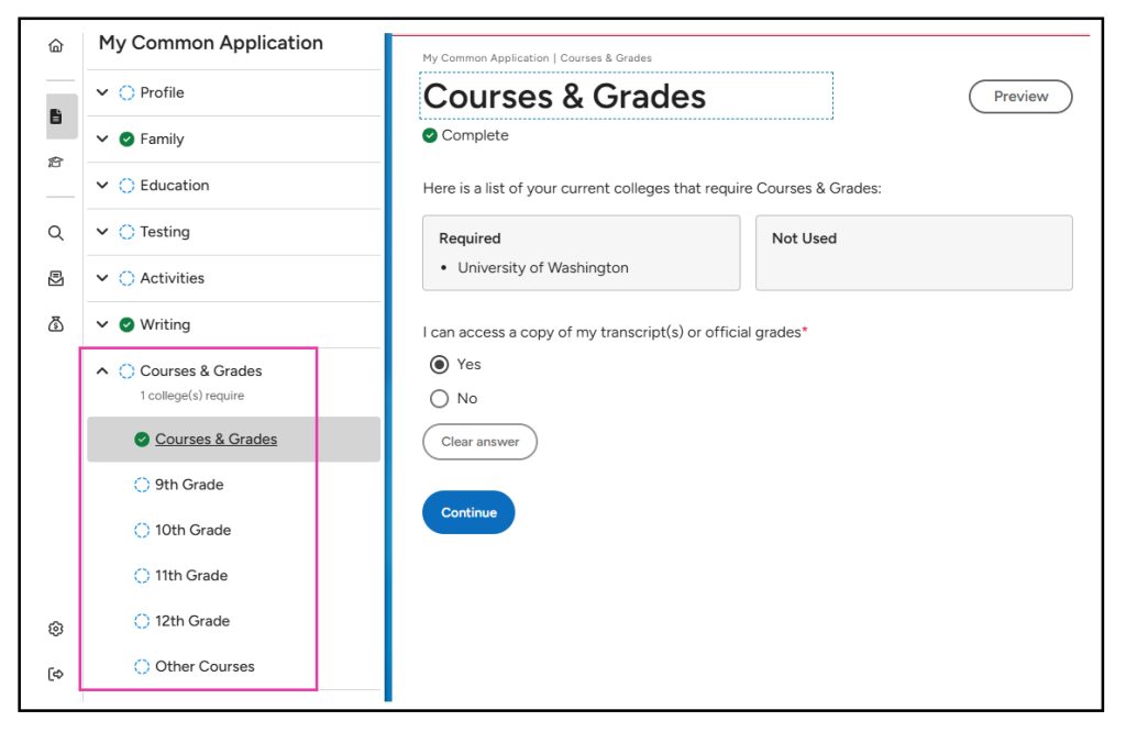 Once you have completed the Current or Most recent Secondary/High School and added your high school and college information to the Common App Profile, you will be able to start entering high school courses in the Courses & Grades section.