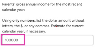 Next, you will report your family gross annual income. If you are dependent, then you will provide your parent(s) or legal guardian(s) gross annual income. For example, if guardian/parent 1 earned $50,000 and guardian/parent 2 earned $50,000 then this would be $100,000. If the parent/guardian doesn’t know how much they will make this year because they own their own business, are self-employed, etc., please provide a best estimate.