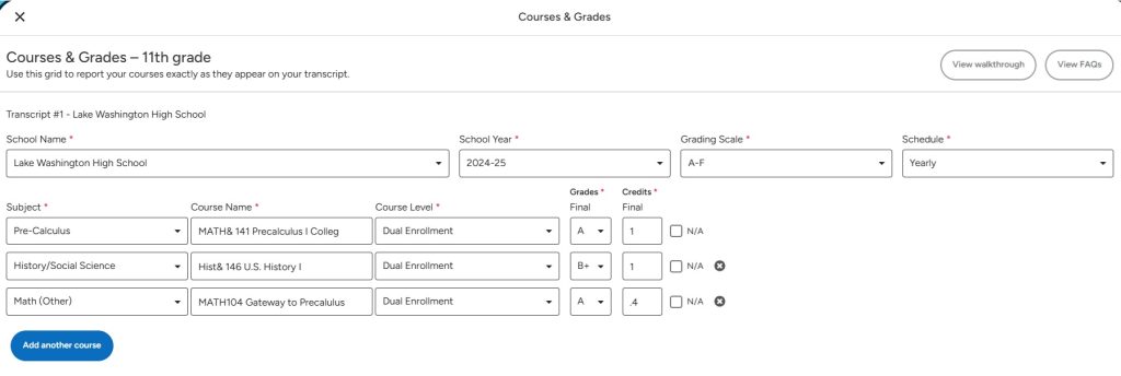 Report your coursework and grades listed on your high school transcript by selecting the appropriate grade level.